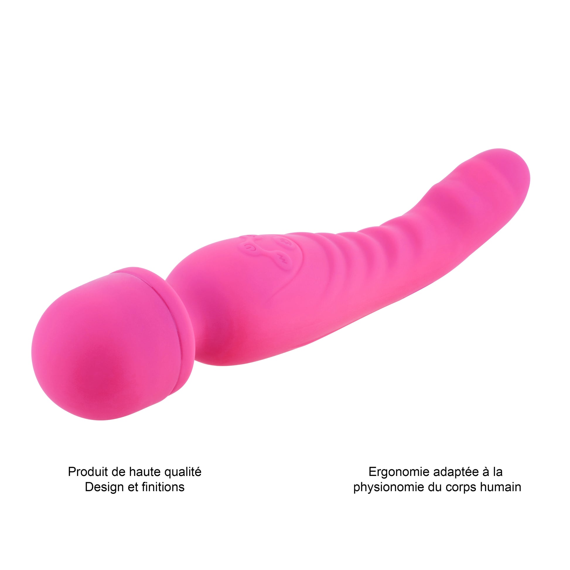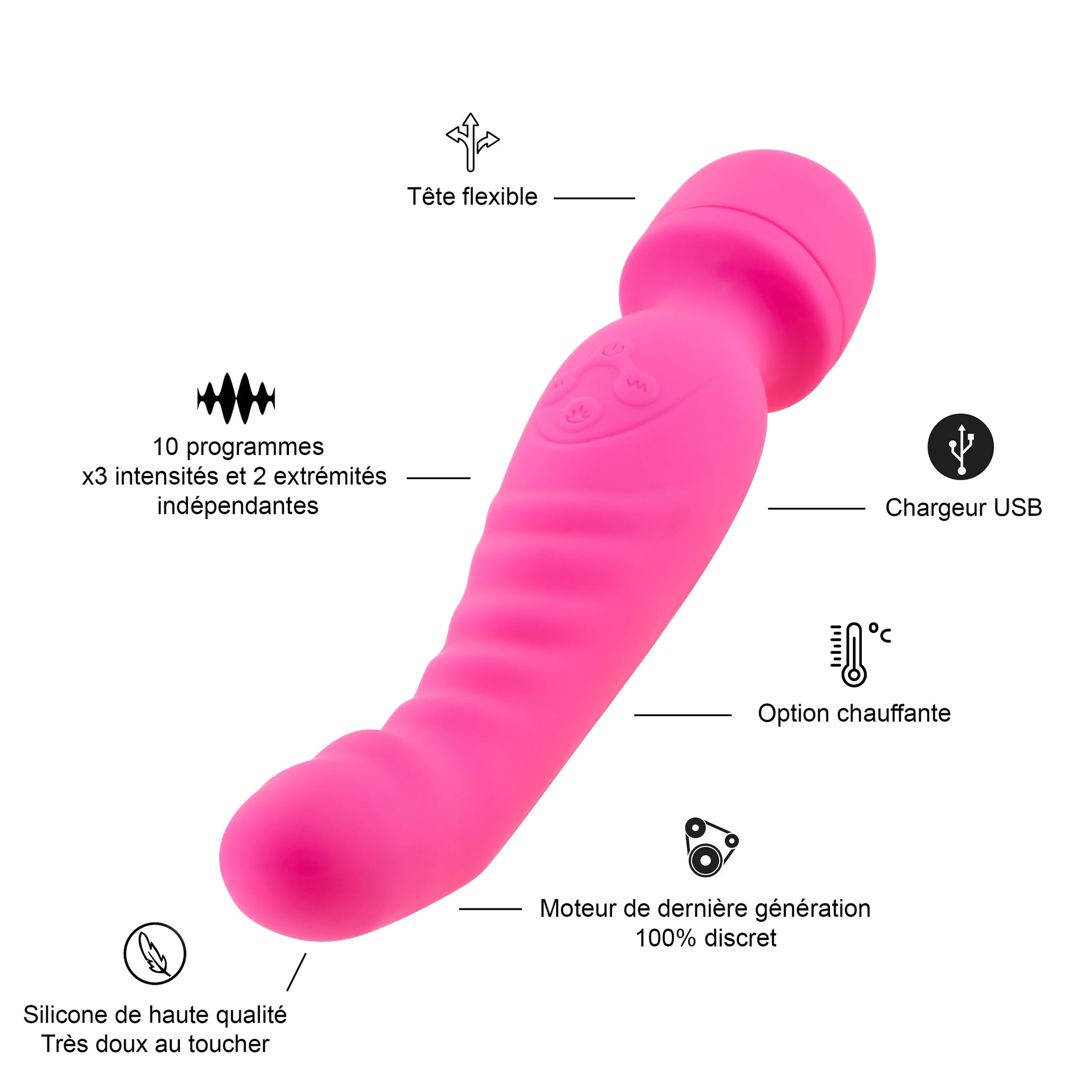 El experto en vibradores wand ofrece un producto de alta calidad con dos funciones principales: un estimulador de clítoris con un cabezal ultraflexible y un vibrador del punto G con una fina punta ondulada. Con 7 modos de vibración en cada extremo y un efecto de calor corporal opcional a 39ºC, este vibrador promete sensaciones variadas e intensas para orgasmos deslumbrantes.